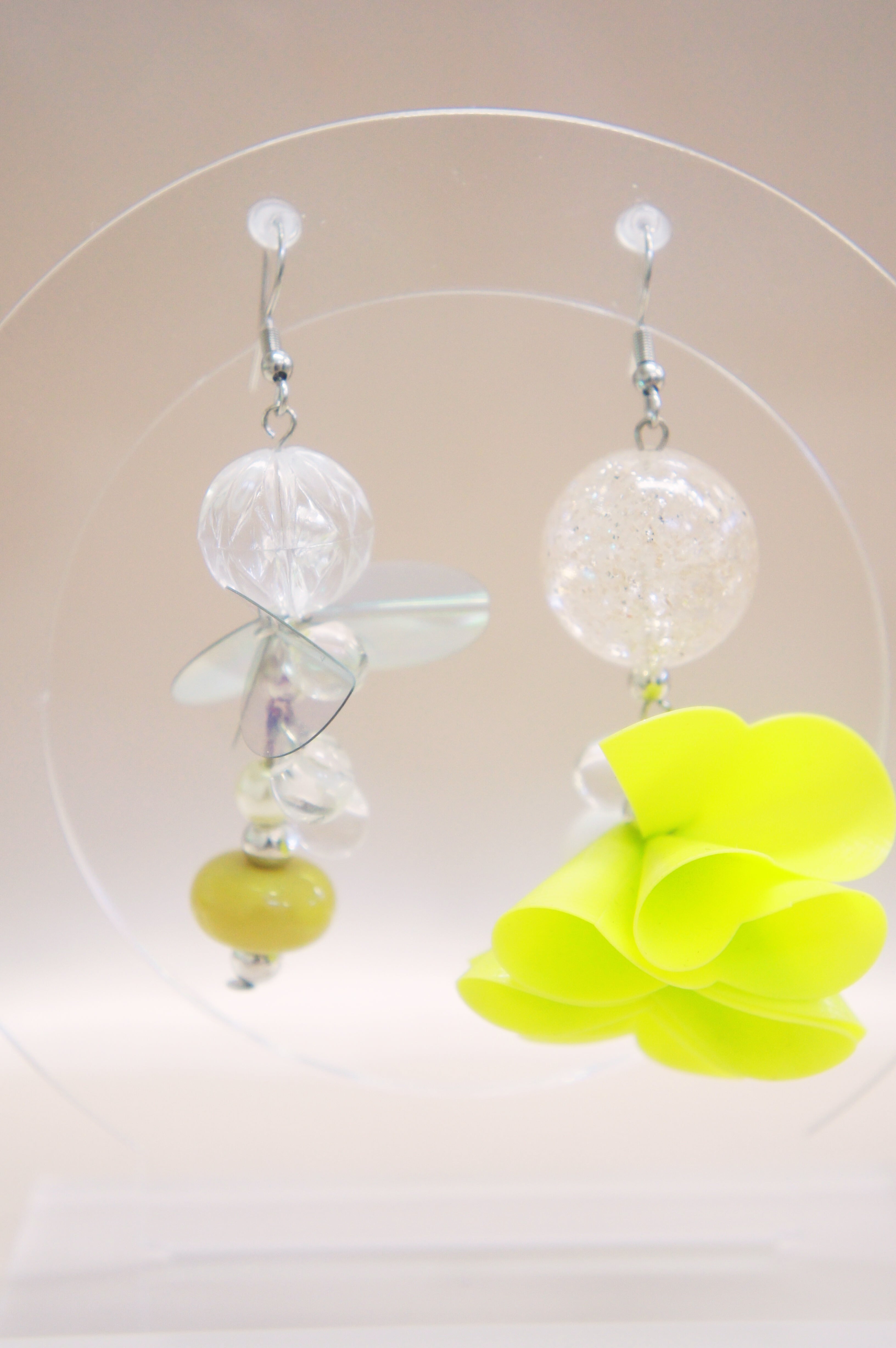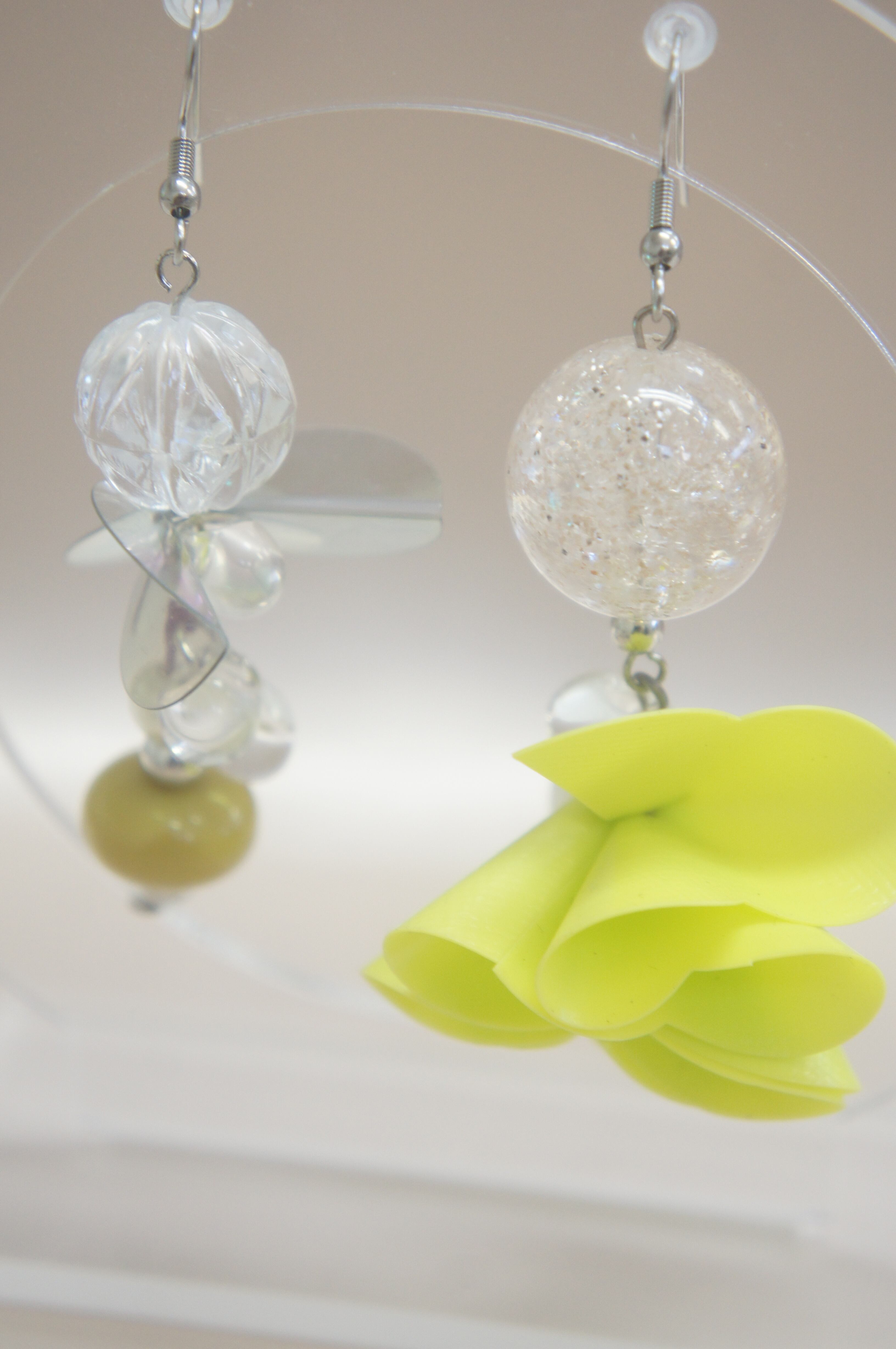 当店の「アシメ・ピアス」は、魅力的な黄緑色と大きな緑のお花が特徴のアシンメトリーデザインのピアスです。ユニークな存在感で、あなたのスタイルを一層引き立てます!